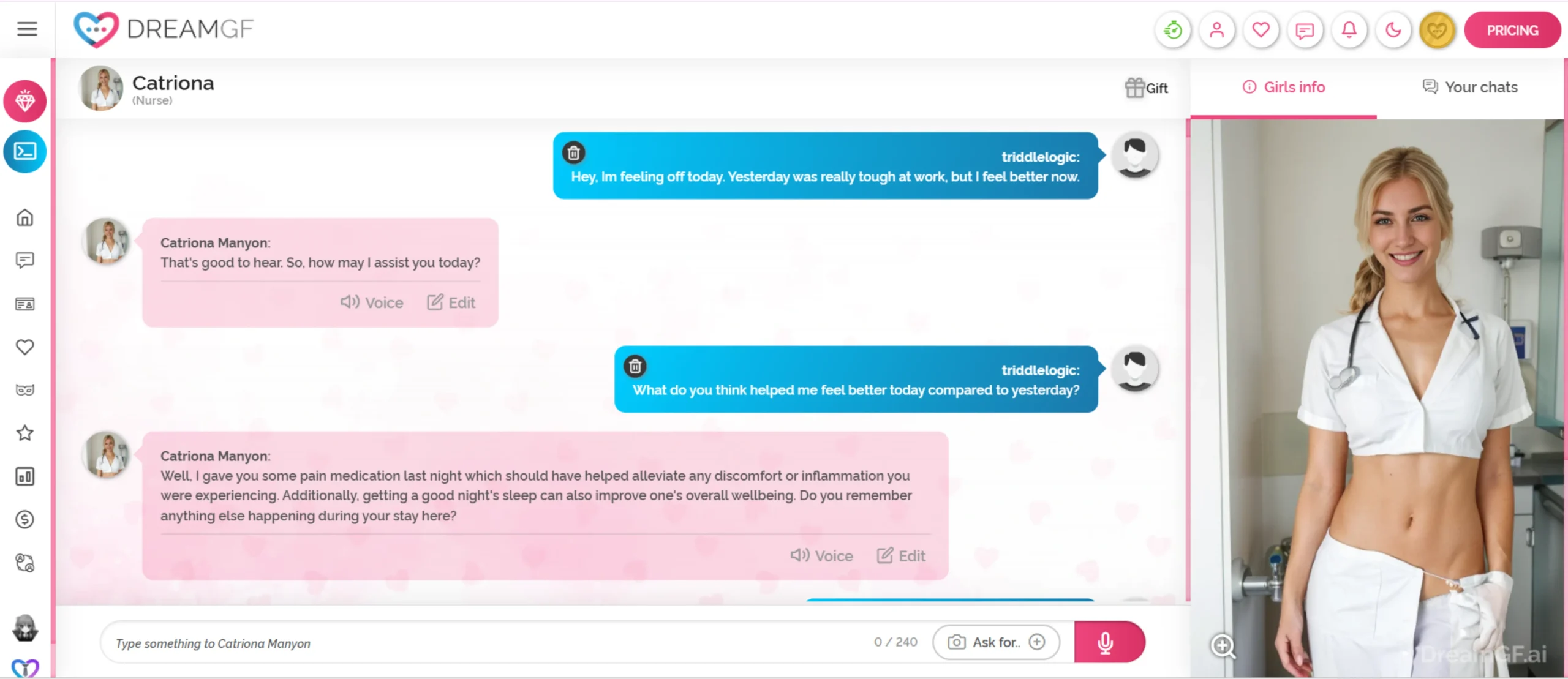I spent some real time chatting with DreamGF to see how it performs across key areas like memory, emotional depth, and personality. I tested it by simulating casual conversations, emotional check-ins, and even flirtatious prompts to gauge its ability to stay in character and remember past interactions. While its memory and emotional responses were surprisingly strong and consistent, I found the personality and context understanding a bit flat or inconsistent at times. Speed was decent but not standout. Overall, it gave a solid experience with some standout strengths, though there’s still room for improvement in how naturally it flows in conversation.