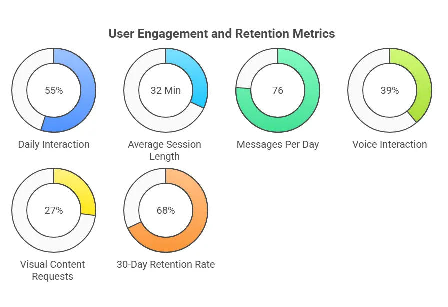 - Daily Check-Ins: 69% of free-tier users and 82% of premium subscribers chat with their AI partner at least once every day.