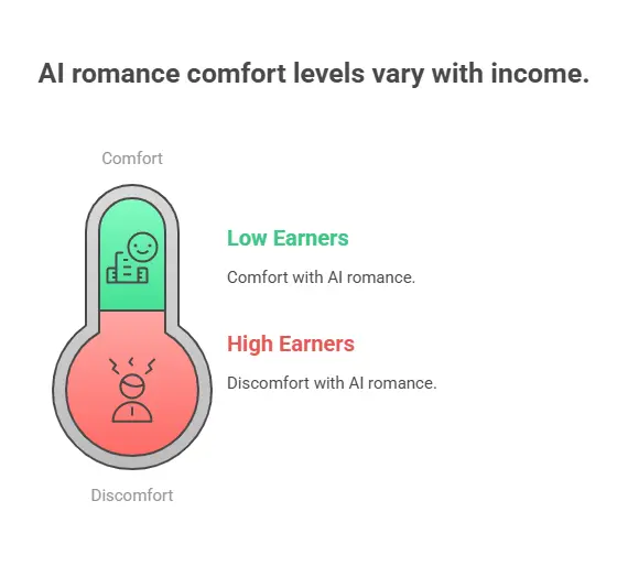 These figures show lower-income users not only embrace AI companionship at higher satisfaction levels but also view it as a budget-friendly alternative to in-person socializing.
