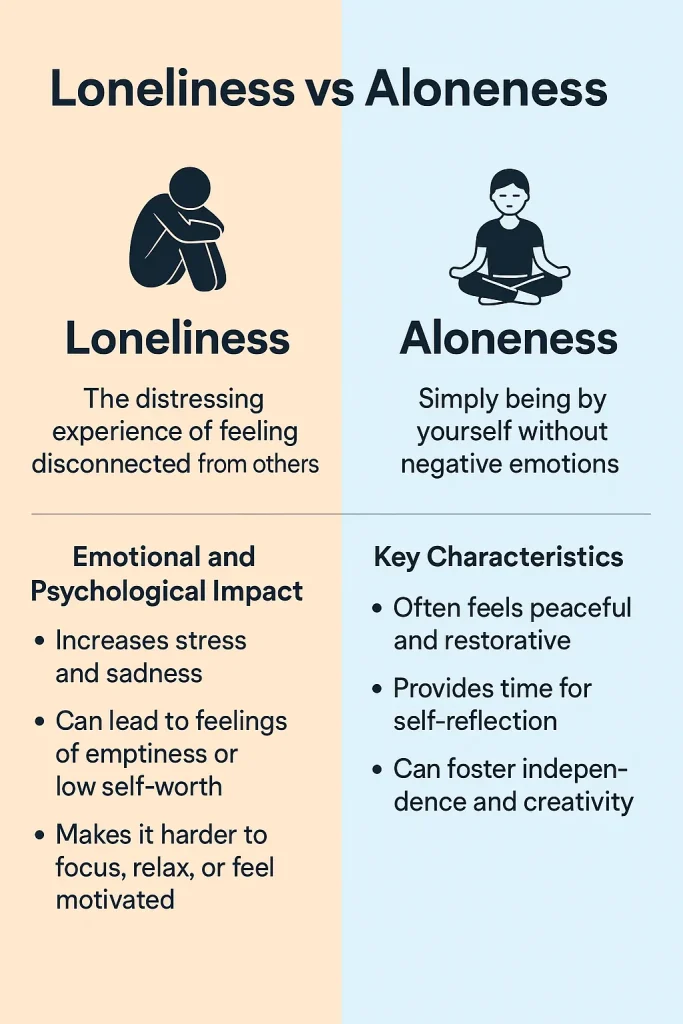 Loneliness and aloneness may sound similar, but they are very different. Loneliness is when you feel disconnected from others and wish you had more connections. Aloneness, on the other hand, is usually a choice — it means spending time alone in a way that feels peaceful and helps you feel better.