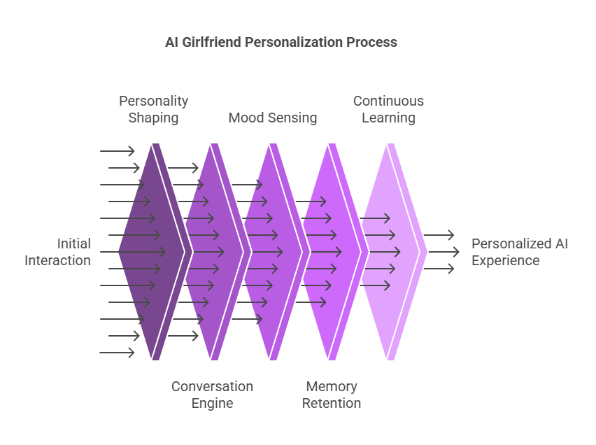 In the graphic above, every message you send goes through a few key stages—first we set her personality, then we read your mood, run it through the conversation engine, and finally pull from memory to craft that perfect reply. Each layer fine-tunes your chat so the experience feels truly personal.