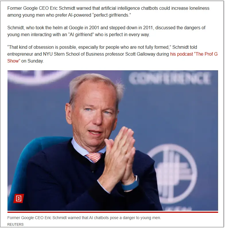 New York Post wrote that Eric Schmidt, former Google CEO, warned that AI girlfriends could worsen male loneliness, especially for younger users retreating from in-person connections. The dopamine feedback loop—AI replies tailored to affection and praise—may be reinforcing, but not always healing.
