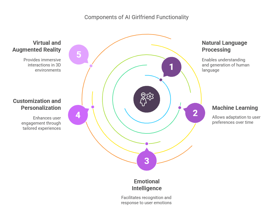 It takes five working parts—language AI that “gets” your words, learning algorithms that pick up your habits, emotion sensors that read your mood, personalization engines that shape her vibe, and AR/VR layers that bring her into your world. The infographic below shows how those pieces fit together in every conversation.
