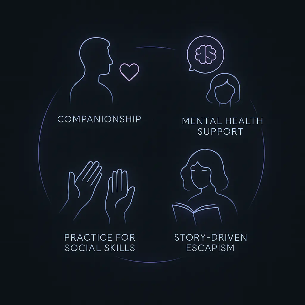 Example: A college student studying abroad checks in nightly with her AI girlfriend for conversation and moral support, turning what would’ve been quiet evenings into friendly chats. - Mental health support and mood regulation