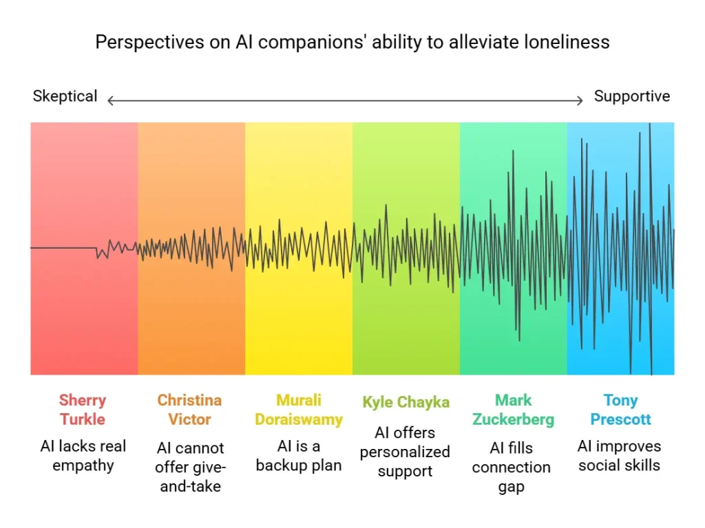 People have different opinions about AI companions. Some think they can help us feel less lonely. Others worry they might make things worse. Here are what a few well-known experts are saying—both for and against:
